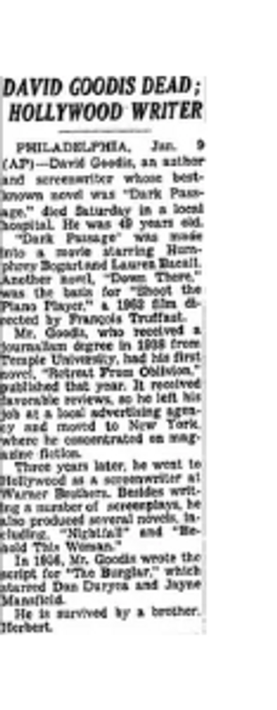 David Goodis Is Dead: Author, Screenwriter From Philadelphia Inquirer, undated, contributed by Louis Boxer